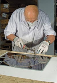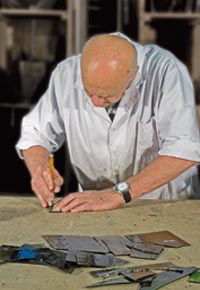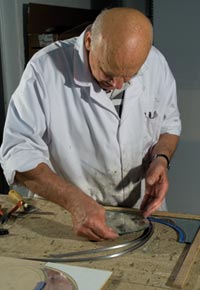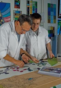 Ecco alcuni particolari della lavorazione artistica. Il procedimento creativo richiede una grande dose di accuratezza cromatica, per questo la scelta del vetro deve avvenire basandosi sulla conoscenza dello stesso e sull'esperienza acquisita negli anni. Inoltre, la precisione della composizione è essenziale per il raggiungimento di un prodotto che non sia solamente bello a vedersi, ma nello stesso tempo durevole e robusto. |
